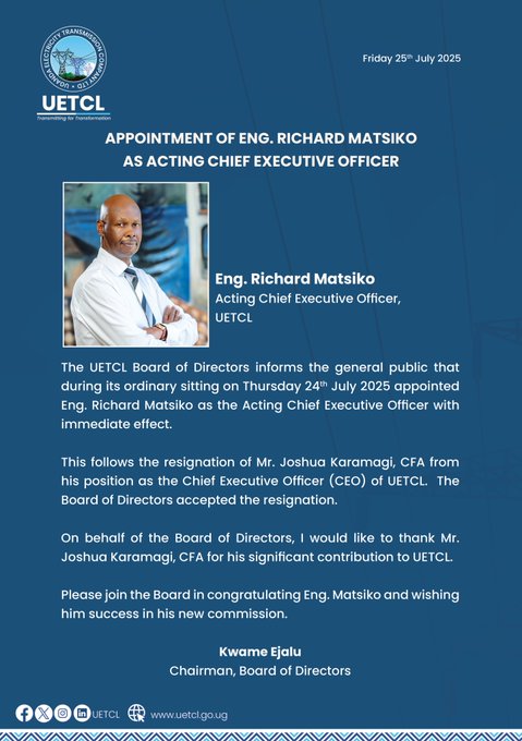 “Notice! The Board of Directors has appointed Eng. Richard Matsiko as Ag. CEO, UETCL. UETCL congratulates Eng. Matsiko and wishes him success in his new commission,” the statement read.