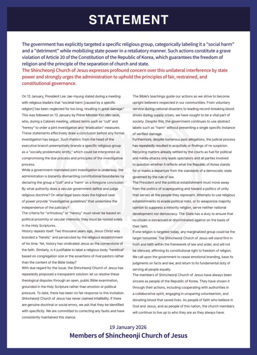 In a statement released on January 19, members of the Shincheonji Church said the administration had mobilised state power in a retaliatory manner by publicly branding a specific religious group as detrimental to society, even as a government-led investigation is ongoing. The church warned that such actions undermine Article 20 of South Korea’s Constitution, which guarantees freedom of religion and the separation of church and state.