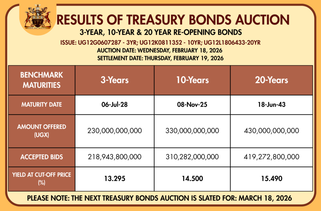 The auction, conducted on 18 February 2026 with settlement on 19 February 2026, offered three tenors: a 3-year bond maturing in 2028 (ISIN UG12G0607287) with a coupon of 15.55%, a 10-year bond maturing in 2035 (ISIN UG12K0811352) at 16.25%, and a 20-year bond maturing in 2043 (ISIN UG12L1806433) with a 15.00% coupon.