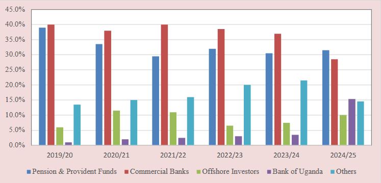Holdings by the Bank of Uganda increased significantly during the year, rising from 4.3 percent to 14.7 percent of domestic debt following the securitisation of advances extended to government. While this was largely a technical adjustment, it contributed to changes in the overall distribution of debt holdings.