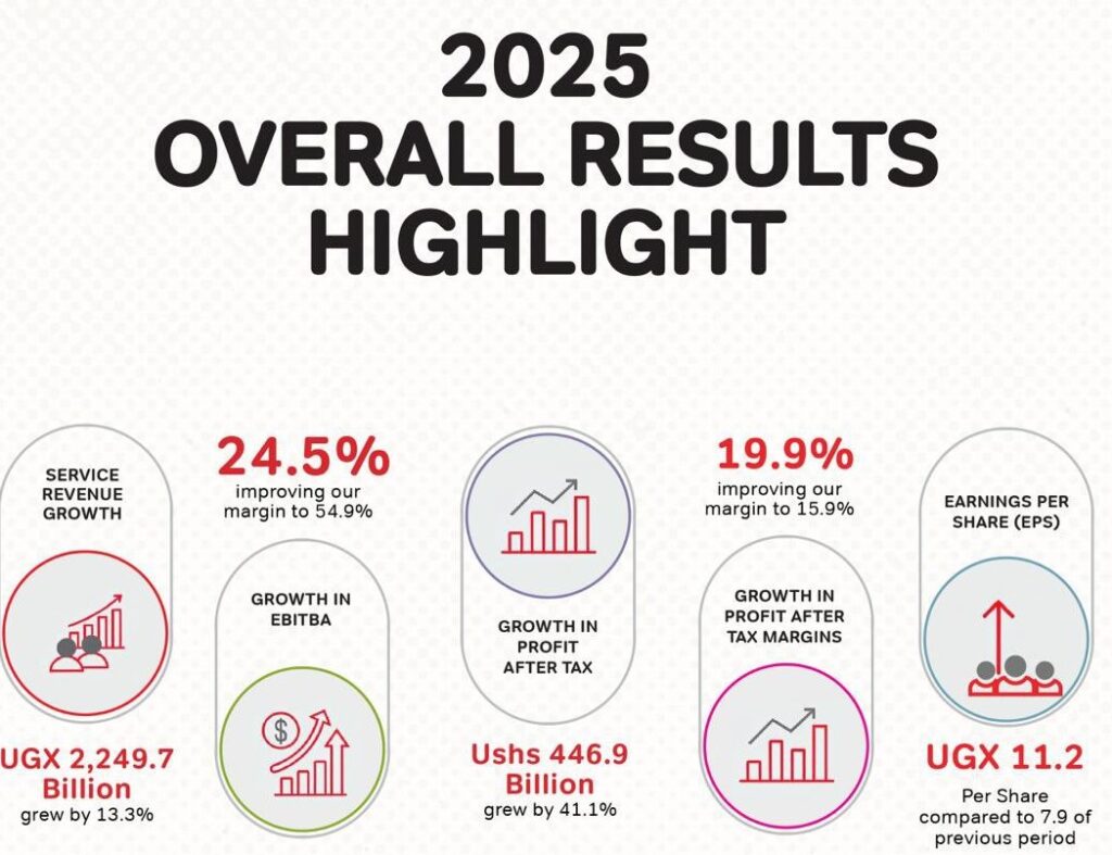 EBITDA rose 24.5 percent to UGX 1.24 trillion, with margins expanding to 54.9 percent from 50 percent a year earlier, reflecting operational efficiencies and disciplined cost management. Profit after tax jumped 41.1 percent to UGX 446.9 billion, lifting profit margins to 19.9 percent despite higher finance costs linked to network expansion and extended tower lease agreements.